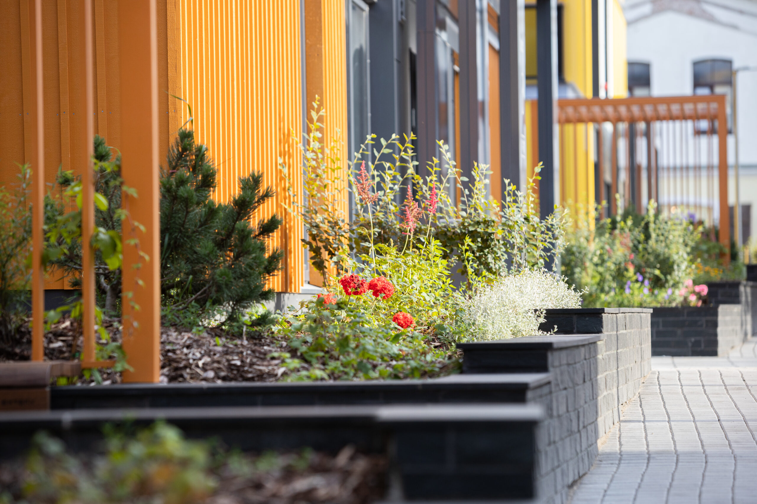 Naabrite pilkude pärast ei pea muretsema – terrassid on ümbritsetud eritasandiliste haljastuste, lillepõõsaste, elupuude ja graniitmüüritistega, mis loovad loodusliku privaatsuse. Kuigi osa taimedest on veel noored, näeb Kotzebue Park juba praegu välja roheline ja hubane nagu armas aedlinn.